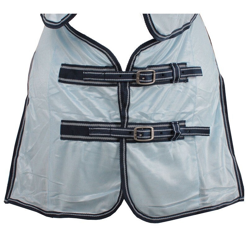 Anti-vliegen deken van mesh materiaal.Productspecificaties:- Afneembare hals- Los masker inbegrepen- Kruissingel- Dubbele borstsluiting met gespen- Loopsplit- Bilkoord